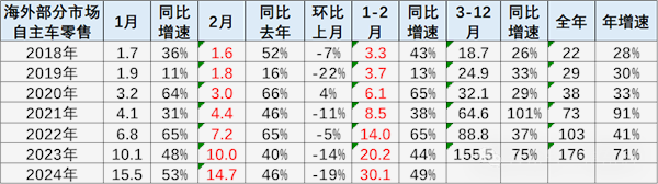 总的来说,中国汽车产业的“出海”旅程,虽然充满了挑战与曲折,但展望未来,无疑是一条充满希望与机遇的光明大道。一个明显的例证就是,中国自主车企在海外部分地区的销量表现出强劲的增长势头。根据2024年2月的初步统计数据,销量达到了15万,同比激增46%,尽管环比有所下滑,下降了19%,但这并不影响其整体的强劲表现。特别是在中国自主的海外部分可统计市场,零售业绩尤为出色。