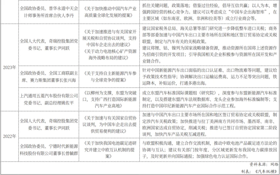 从200万辆到300万辆,再到近500万辆,近三年我国汽车出口连创新高,成为拉动汽车产销量增长的重要力量。业界对这股力量的关注程度,也体现在每年的全国“两会”上。《汽车纵横》通过梳理近三年的两会提案议案,发现关于汽车“出海”的话题逐年增多,从前两年的二三条建议,增加到今年的七条,多位两会代表委员分别从自己的角度对汽车“出海”如何再攀高峰建言献策。(见附表)
