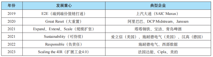 从2019年至今,世界格局发生了前所未有的变化,全球灯塔工厂顺势而为。2020年新冠病毒全球大流行,倒逼制造企业进行数字化转型;2021年,气候危机席卷全球,领先企业纷纷着眼绿色可持续发展;2022年,人本主义兴起,具有前瞻性的领导者开始加强劳动力关怀与培训。在2023年最新的白皮书中,灯塔工厂“预测趋势”的决策能力被提升到新的战略高度。从这个意义来说,灯塔工厂富有一定的先锋性,它们善于洞察和应变,不断转换自己的发展重心(表3)。