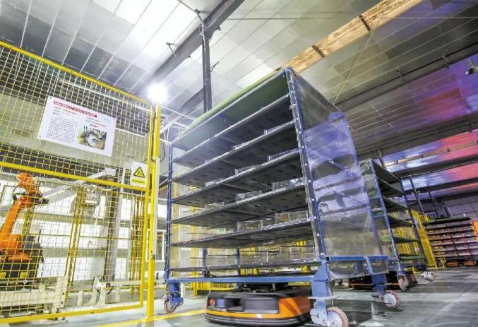 注塑分厂内,原材料自动配比,在注塑机上自主压制成型,机器人将产品放置在指定货架上。货架存放满后,系统“呼叫”AGV机器人前来运输; 数字化转型网(www.szhzxw.cn)