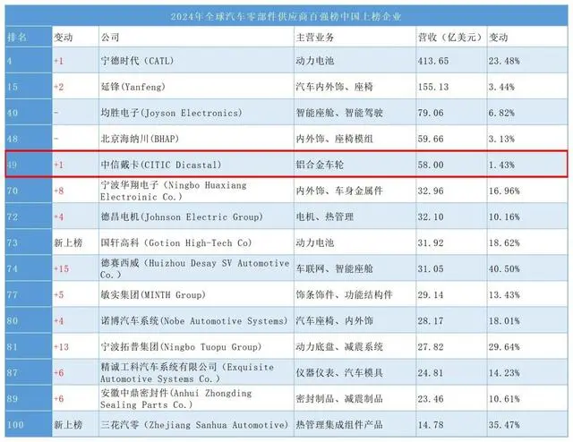 根据世界权威汽车媒体《美国汽车新闻》(Automotive News)发布的2024年全球汽车零部件供应商百强榜里,中国共有15家企业上榜。作为首家跻身全球汽车零部件百强的中国本土企业,中信戴卡连续13年上榜,以58亿美元(约合人民币422亿元)营收排名第49位,较上一年度前进1位,创下历史最好排名。