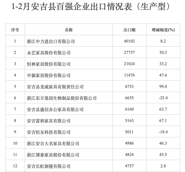 恒林诞生的地方,在浙江湖州安吉县,2023全年全县外贸进出口累计1490亿元,家具企业累计出口204亿元,占全县总出口总额54.5%,恒林出口额排在第二,2024年1-2月安吉县百强企业出口榜,家具类前三分别是永艺家具[603600]、恒林家居[603661]、中源家居[603709]。(下图单位:万元)