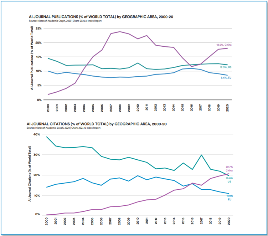 根据斯坦福研究院Human-Centered AI发布的《2021年人工智能指数报告》,在三大人工智能强国(中国、美国和欧盟)中,中国的人工智能论文发表量和被引用量均居全球首位。2020年中国期刊发表数量以18.0%的比例超过美国(12.3%)和欧盟(8.6%)。