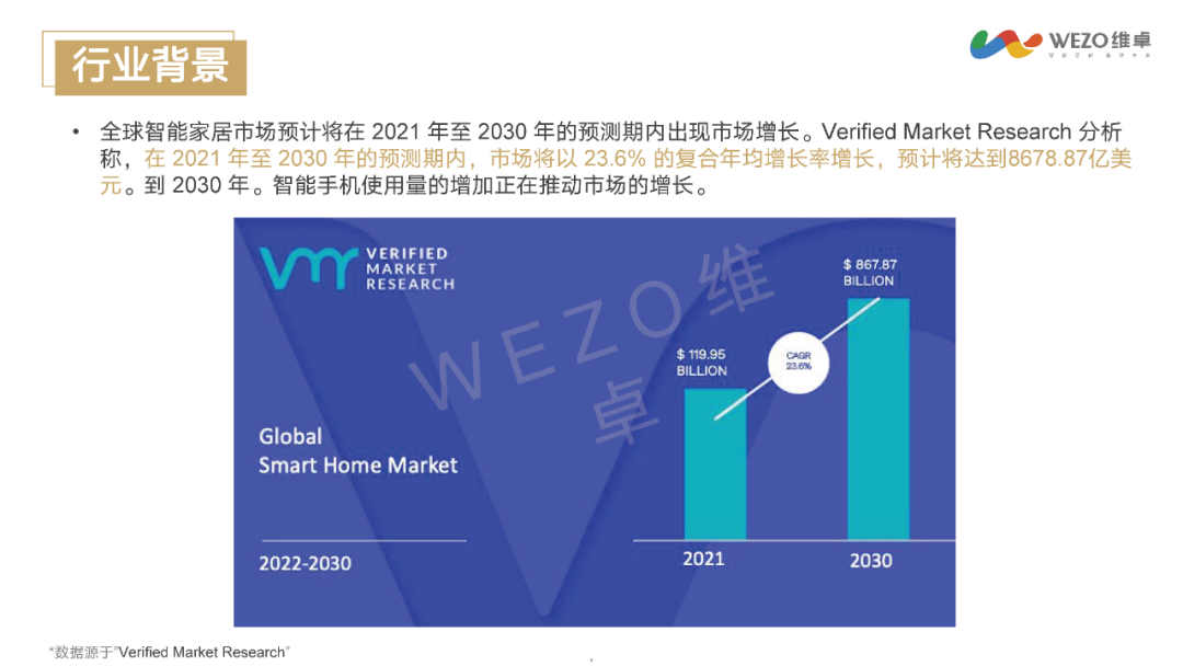 智能家居市场正以惊人的速度增长。根据Verified Market Research的分析,预计在2021年至2030年间,市场将以23.6%的复合年均增长率增长,达到8678.87亿美元的规模。智能手机的普及、宽带(Wi-Fi 6)的覆盖增加、消费者对智能家居设备节能、便利性及效率认识的提高,都是推动市场增长的重要因素。