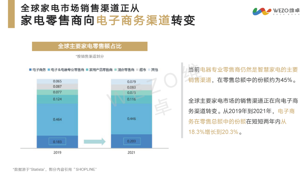 全球家电市场销售渠道正经历从传统家电零售商向电子商务渠道的转变。电子商务渠道的份额在短短两年内从18.3%增长到20.3%,显示出线上渠道的重要性日益增强。