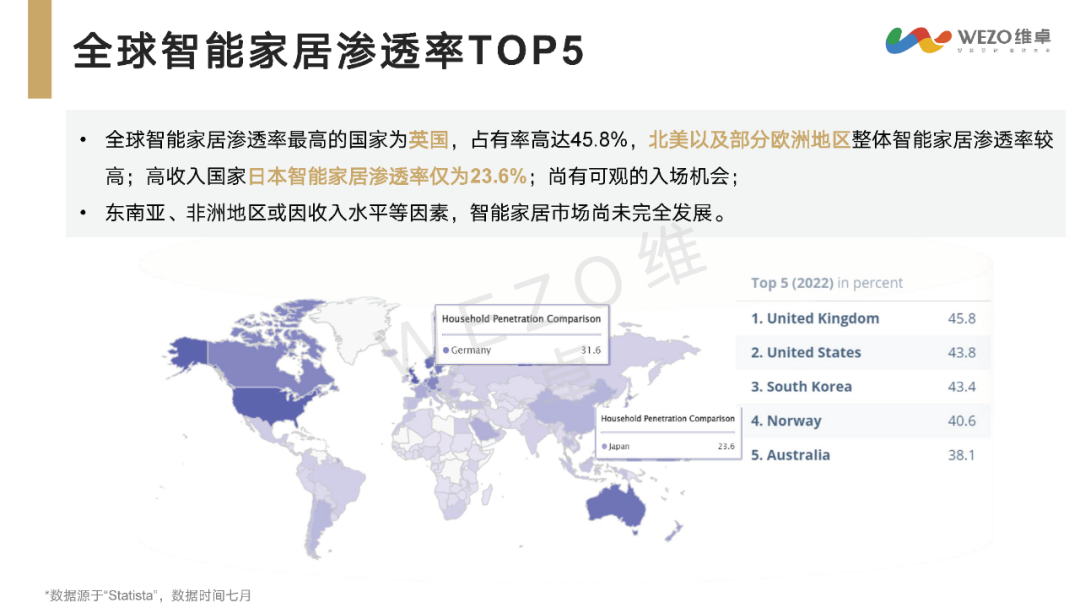 美国在全球智能家居市场中占有主导地位,而英国则在智能家居渗透率方面领先。东南亚和非洲地区由于收入水平等因素,智能家居市场尚未完全发展,但提供了巨大的市场潜力和入场机会。