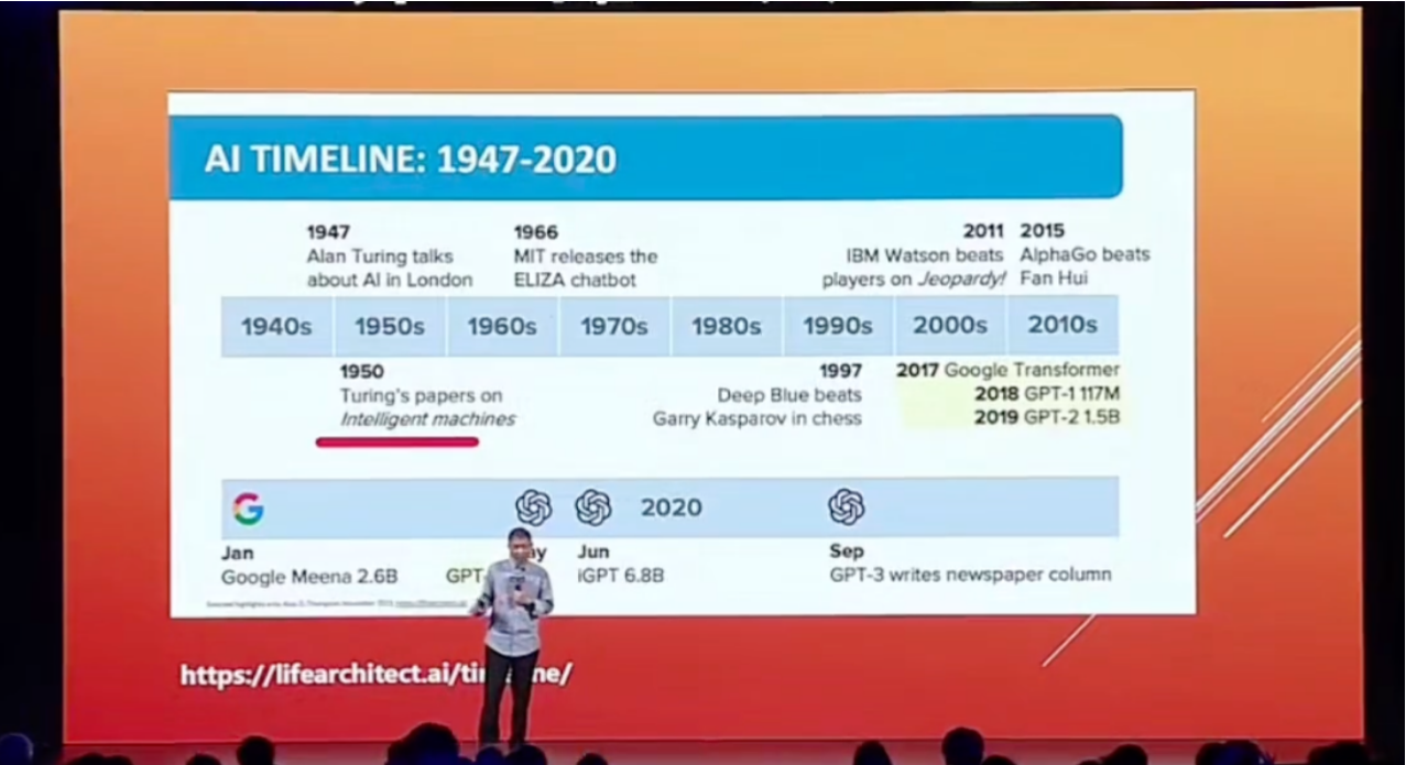 我想用一张图,当时我看到以后,为什么让我会想起人工智能有一个很长的过去,只有很短的历史?你今天看到那个红线画的地方,就是大概在40年代末50年代初,就是图灵写了篇文章叫intelligent machines。