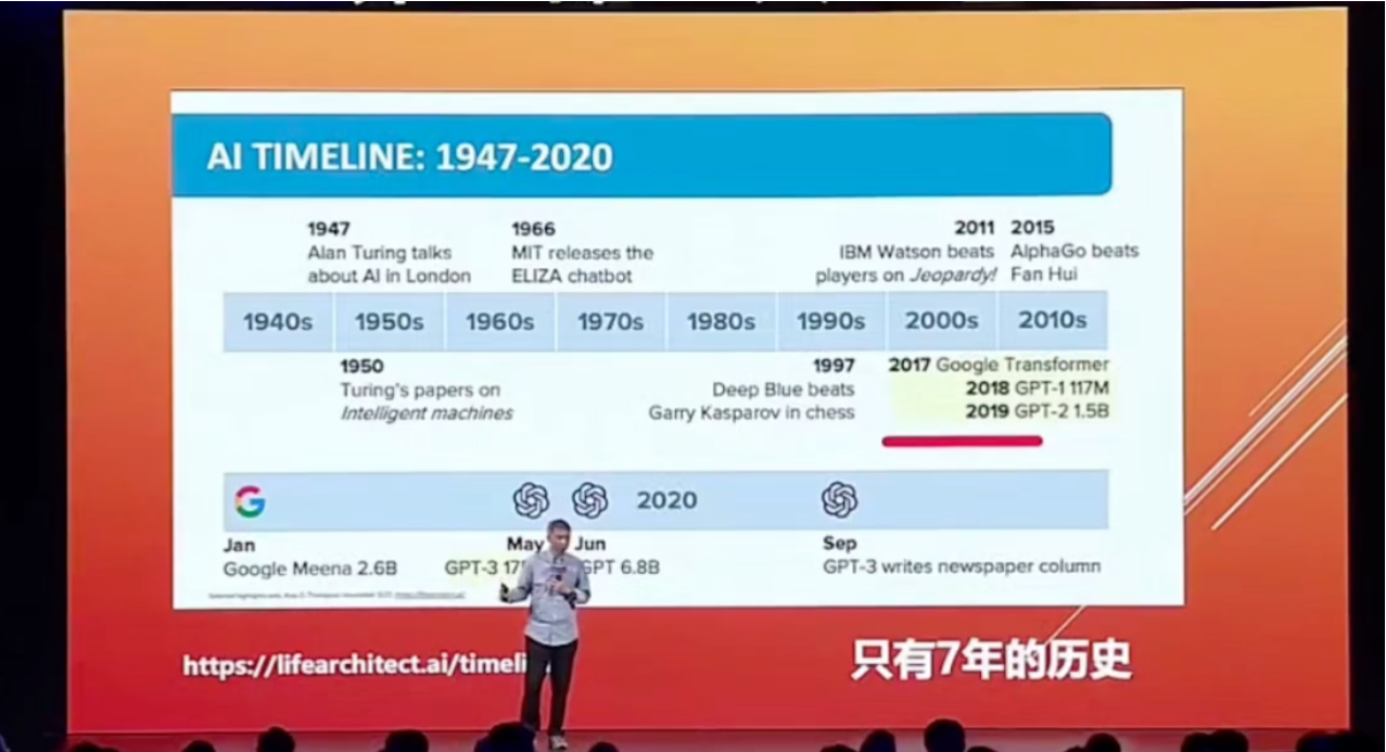如果你看再回到刚才这张图上,现在这个红线里边就讲到了2017年,就是 Google开始提出了transformer这件事情。