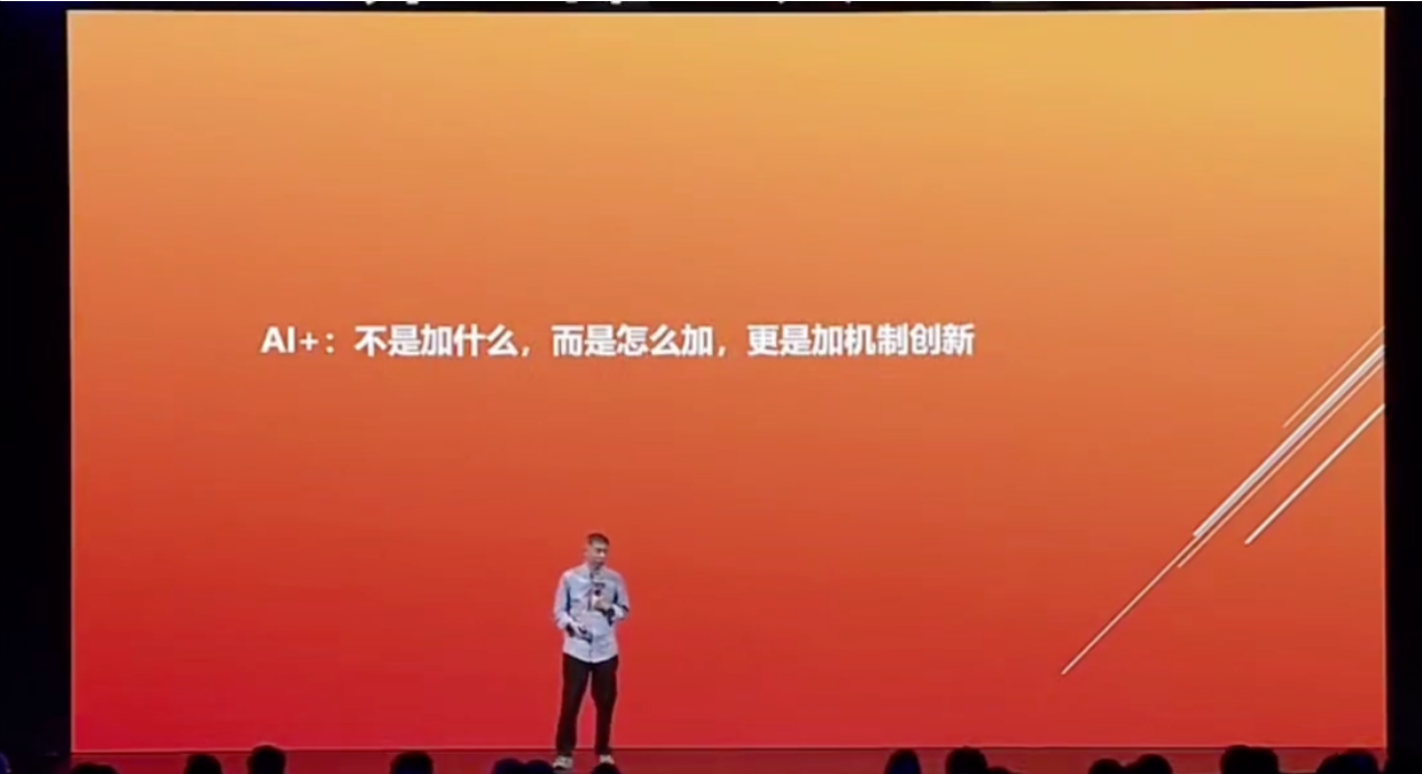 所以大家设想一下看,在transformer这个逻辑下,我们要理解的人工智能+到底是什么。所以大家可能今天一谈到人工智能+的时候,就会简单的加一个行业进去。我用我自己的话来讲,其实这是没有比在人工智能+后面加一个行业把人工智能庸俗化的做法了。所以就是反复思考的人工智能+到底是什么?