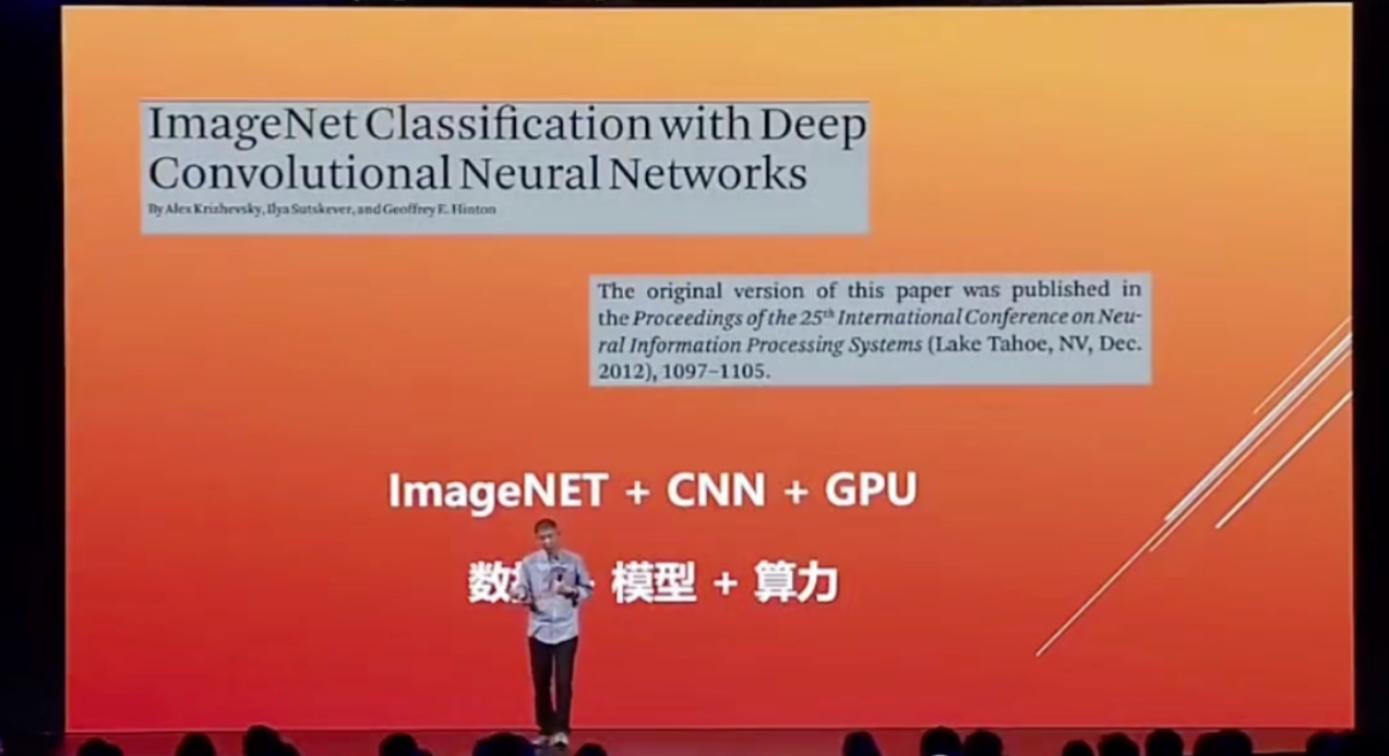这篇文章,至少在做机器学习也好,图像识别也好,一定知道这篇文章。但你把这篇文章抽象出来,它就三个东西,就是今天构成我们人工智能,大家天天在讲的三个东西,就是:imagineNet,就是有组织的数据,完了有一个模型,那时候叫CNN,完了加GPU。这是第一次一篇文章完美地把三个东西结合在一起。