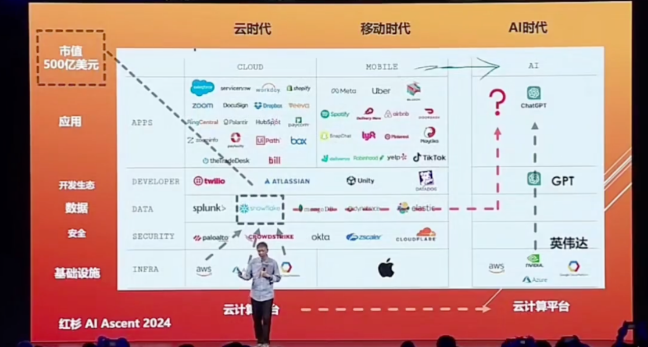 当然是AI基础设施不是我发明的,今天大家都在谈的。所以我想为什么从AI到AI+到我们今天可以讲AI基础设施的话,是一个非常值得我们深思的。那下面我也会很快说一下,这是红杉在一次研讨会上用的一个幻灯片。把它拿过来了。拿过来的目的,只是为了看大家最下面一行,他就会叫做基础设施。
