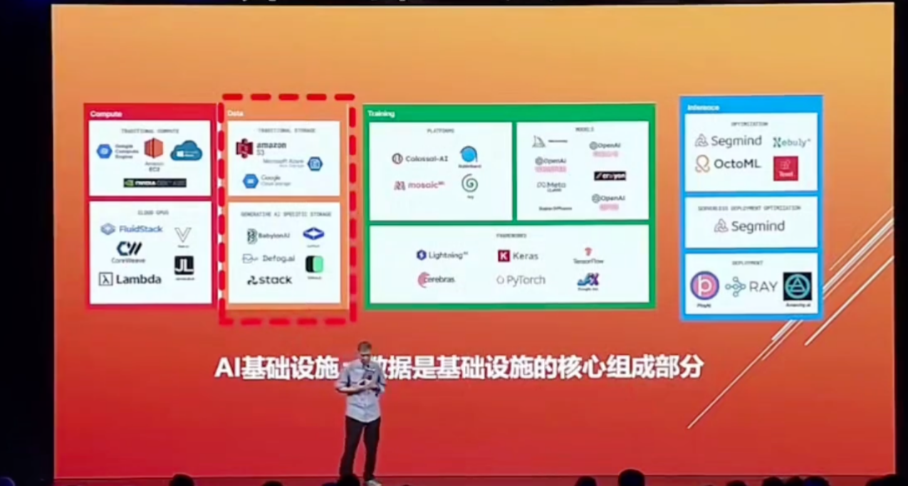 我把这个红框里面画出来,其实这张图很有意思地告诉大家,数据是基础设施的核心的组成部分。数据不只是一个模型的附属品,这个数据也不只是一个计算的附属品。只有所有这些东西变成一个完整的基础设施的时候,我们才会有那一次更加激动人心的创新。