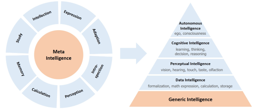 元智能包括理解、表达、抽象、推理、创造和反思等人类高级能力,其中包含人类积累的知识。元智能以碳基生命为载体,是由个体和生物群体经过百万年的进化产生的,它包括生物具身智能、脑智能(尤其是人脑)和群体智能。所有的智能系统都是由人类设计和建造的。