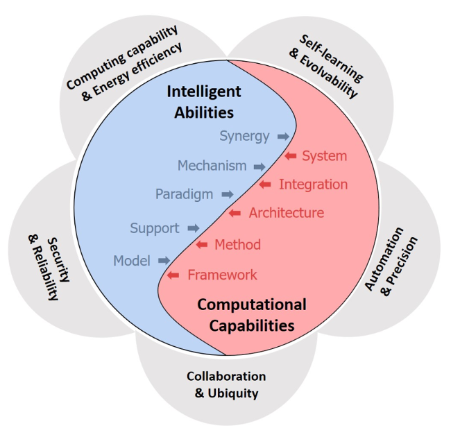 在理论技术上具有以下特点(图4):理论技术上的自学习和可进化性,架构上的高计算能力和高能效,系统方法上的安全性和可靠性,运行机制上的自动化和精确性,以及服务性上的协作和泛在性。智能计算包括两个本质方面:智能和计算,两者相辅相成。