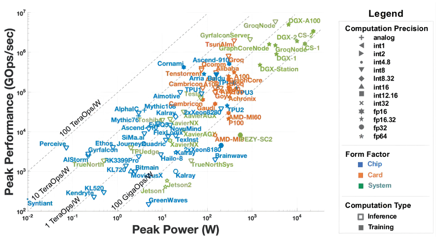 图11:公开发布的 AI 加速器和处理器的峰值性能与功耗散点图
