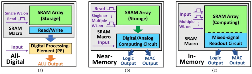 图12:计算的三种概念方法:(a)传统数字计算,(b)近内存阵列计算(NMAC)和(c)内存阵列计算(IMAC)