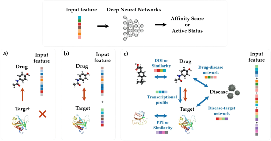 图18:不同的基于深度学习的药物-靶点相互作用预测算法对应不同的输入特征。(a)基于配体的方法,(b)基于结构的方法,和(c)基于关系的方法