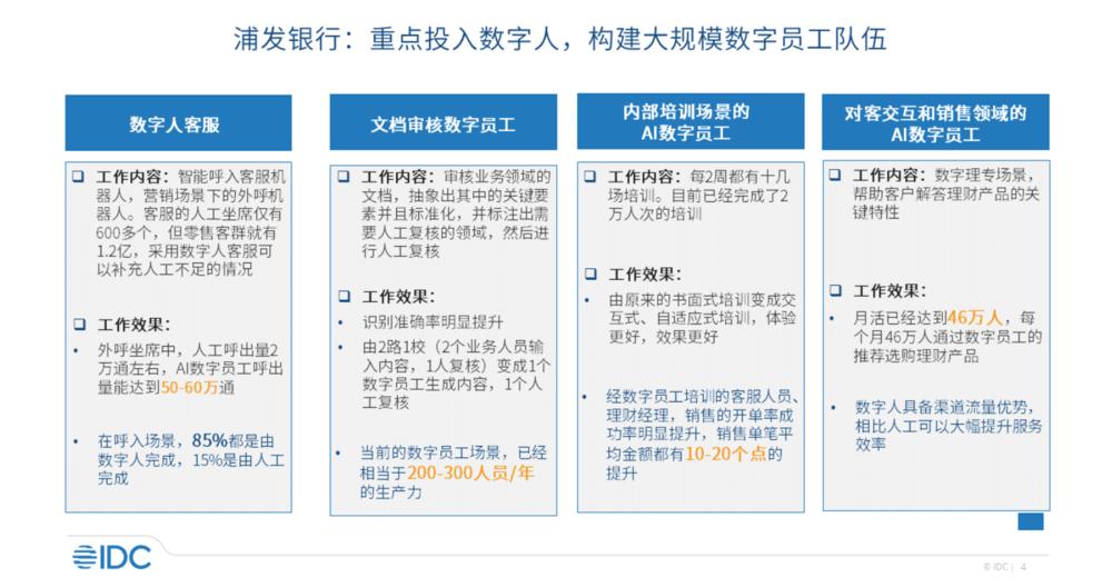 以 IDC 2022 年发布的一份《中国AI数字人市场现状与机会分析,2022》报告为例,浦发银行的数字人规划包括四点:数字人客服、文档审核数字员工、内部培训场景的 AI 数字员工、对客交互和销售领域的 AI 数字员工。 数字化转型网www.szhzxw.cn