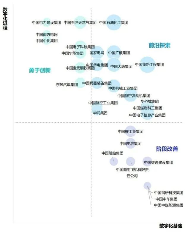 亿欧智库根据数字化转型基础与数字化转型进程两个维度,对中央企业数字化转型成熟度进行梳理,并从综合排名前30的企业中划分出3类不同的企业,分别为前沿探索、勇于探索和阶段改善。结果如图所示: