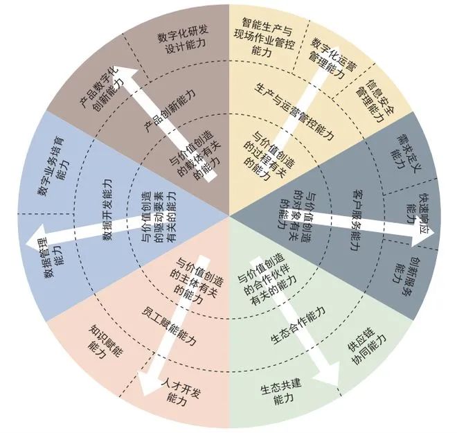 业态转变。业务体系颠覆式创新,专注于发展壮大数字业务,价值创造和传递活动由线性关联的价值链、企业内部价值网络转变为开放价值生态,价值获取主要来源于与生态合作伙伴共建的业务生态。