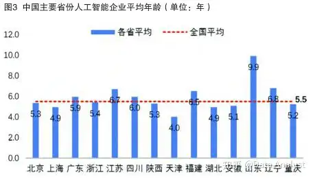 中国人工智能企业的平均年龄为 5.5 年。其中,北京、上海和天津等地初创企业云集,企业平均年龄相较于全国平均水平更年轻,平均年龄在 5.5 年以下。山东和辽宁等地老牌工业机器人和自动化企业转型较多,企业年龄相对较大。