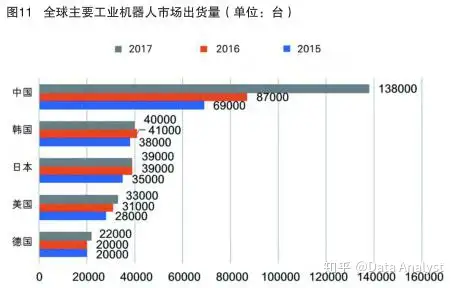 根据 IFR 2018 年 6 月最新发布的数据,2017 年全球机器人市场规模已达 500 亿美元。2017 年全球工业机器人的总销量达 38 万台,同比增长 29%。中国自 2013 年以后一直是全球最大的工业机器人市场。2017 年,中国的工业机器人销量达 13.8 万台,其次是韩国,约 4万台,日本销量约有 3.8 万台。在美洲,美国是最大的单一市场,销售了约3.3万台工业机器人。在欧洲,德国售出了约 2.2 万台。中、韩、日、美、德五国 2017 年工业机器人销量占全球总销量的 71%(图 11)。
