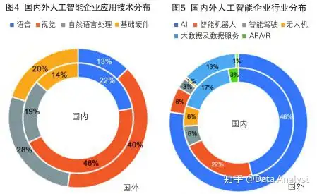 人工智能在行业应用上包括智能机器人、智能驾驶、无人机、AR/VR、大数据及数据服务、各类垂直领域应用(本文中定义为“AI+”)等。国内外人工智能企业的行业应用分布如图 5 所示。可以看出,相比于国外,国内企业更看重智能机器人、无人机和智能驾驶等终端产品的市场,而国外企业更注重 AI在各类垂直行业的应用。