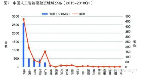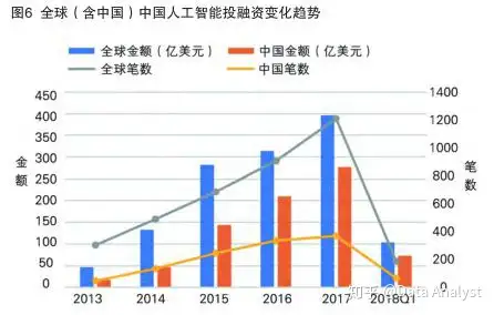 根据 2013 年到 2018 年第一季度全球的投融资数据,中国已在人工智能融资规模上超越美国成为全球最“吸金”国家,但是在投融资笔数上,美国仍然在全球处于领先地位。