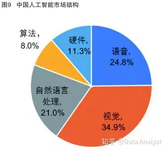 2017 年中国人工智能市场规模达到 237.4 亿元,相较于 2016年增长 67%。其中以生物识别、图像识别、视频识别等技术为核心的计算机视觉市场规模最大,占比34.9%,达到 82.8 亿元(图 9)。