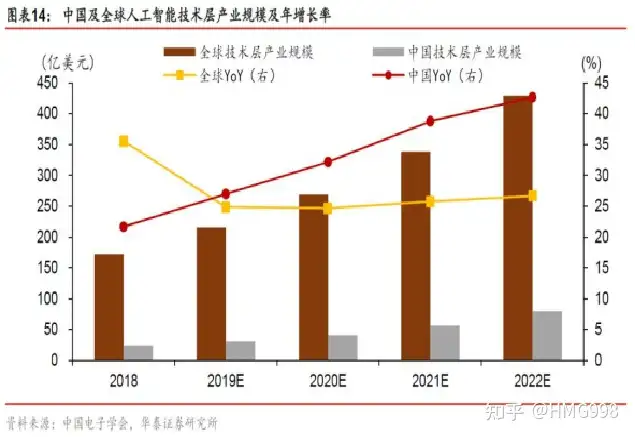 应用层是我国人工智能市场最为活跃的领域,其市场规模和企业数量也在国内AI分布层级占比最大。据艾瑞咨询统计,2019年,国内77%的人工智能企业分布在应用层,已有部分企业居于世界前列。