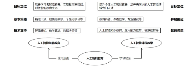 教育学者从不同的视角和层次出发,按照观点内容的指向性,将人工智能教育的内涵分为三大类: