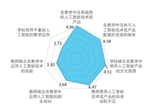 受访教师对人工智能在教学中的应用较为满意,认为在教学中应用人工智能技术可以提高他们的教学自信心,但同时也反映在操作人工智能产品中遇到困难的问题。教师认为最阻碍在教学中有效应用人工智能技术的因素是缺乏成熟的智能产品以及配套的资源与服务,其次是中小学中缺乏对一线教师进行人工智能相关课程的系统培训。
