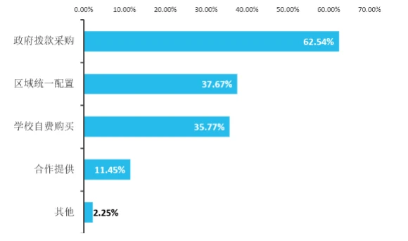 受访学校拥有的智能技术硬件设备或软件设施等资源,超过半数以上是通过“政府拨款采购”的方式获取的,这表明在人工智能进入中小学的过程中,政府发挥着重要的作用,为课程资源的配置提供坚实的政策和资金支持。