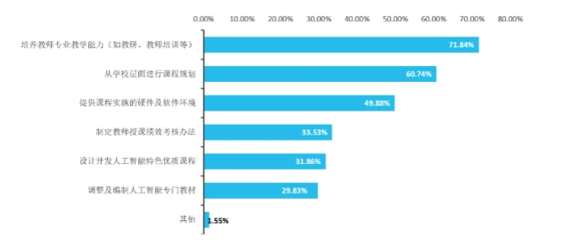 2、学校管理层普遍积极推进人工智能课程,教师能力培养和课程体系完善是当务之急。