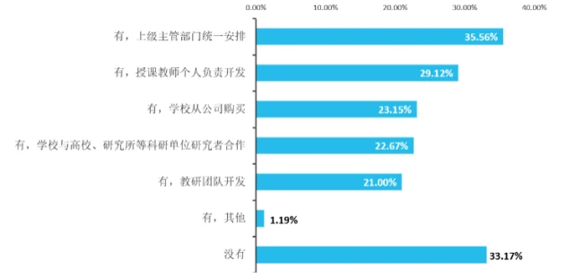 中小学人工智能课程教材的获取途径主要分为两种:直接采购和自主研发;教材的购买主体一般为学校,而教材的开发主体一般为人工智能课程教师,仍有近三分之一的教师表示其所在学校的人工智能课程并没有配备相应的教材资源。