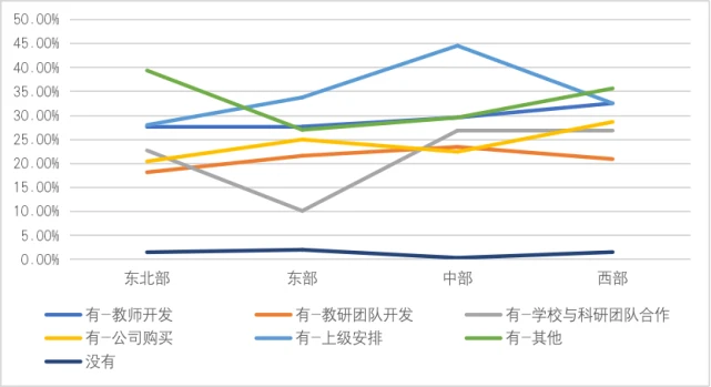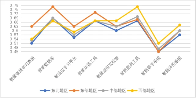 1.东部地区学校的信息化基础设施情况和人工智能设施设备情况都是最好的,而东北地区的人工智能系统情况不够乐观,这将导致地区间差异逐渐拉大,更会影响后续人工智能课程的开设与发展。