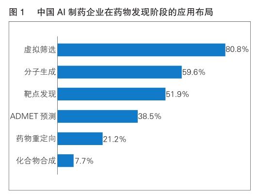 近年来,随着基因组测序工程的快速进展、二代测序技术的快速普及、人工智能技术的进步和高性能计算机的发展,AI制药应运而生,发展迅速。从制药流程来看,AI技术已渗透到包括靶点发现、化合物合成和筛选、晶型预测、机制探索、选择受试人群、药物警戒等多个环节。相较于传统药物研发,AI技术能将药物发现、临床前研究的时间缩短近40%,新药研发成功率可从12%提高到约14%。中国AI制药企业在药物发现阶段的应用布局涉及虚拟筛选、分子生成等领域。(详见图1)