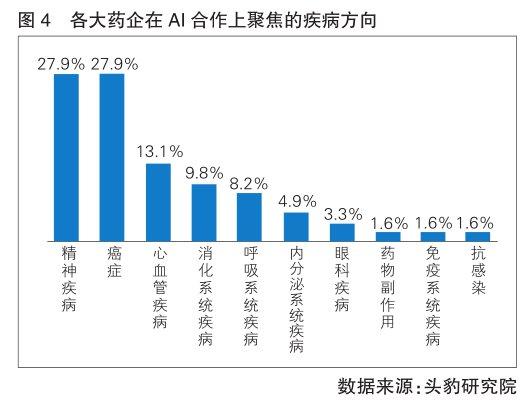 各大药企在AI制药合作项目上,聚焦的病种广泛分布在抗肿瘤、呼吸系统、抗感染等多个领域,其中大型药企在癌症和精神疾病领域的合作项目占比最高,均为27.9%,其次为心血管疾病,占比13.1%。(详见图4) 数字化转型网www.szhzxw.cn