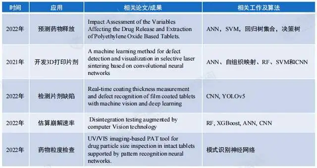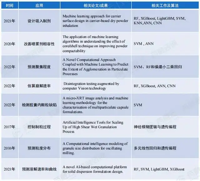 目前,AI辅助药物剂型设计的应用有:预测药物释放、开发3D打印片剂、检测片剂缺陷、估算崩解速率、药物粒度检查、设计吸入制剂、改善喷雾剂相容性、预测聚集程度、估算崩解速率、检测胶囊内颗粒缺陷、控制制粒过程、预测粒度分布、预测溶解速率和曲线等。