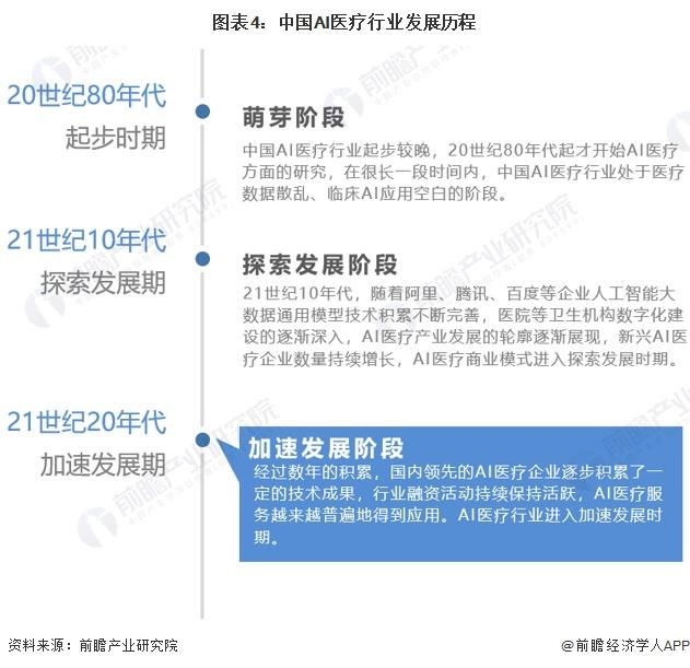 中国AI医疗行业起步较晚,20世纪80年代起才开始AI医疗方面的研究。21世纪10年代,随着阿里、腾讯、百度等企业人工智能大数据通用模型技术积累不断完善,医院等卫生机构数字化建设的逐渐深入,AI医疗产业发展的轮廓逐渐展现。近年来,国内领先的AI医疗企业逐步积累了一定的技术成果,行业融资活动持续保持活跃,AI医疗服务越来越普遍地得到应用,AI医疗行业进入加速发展时期。