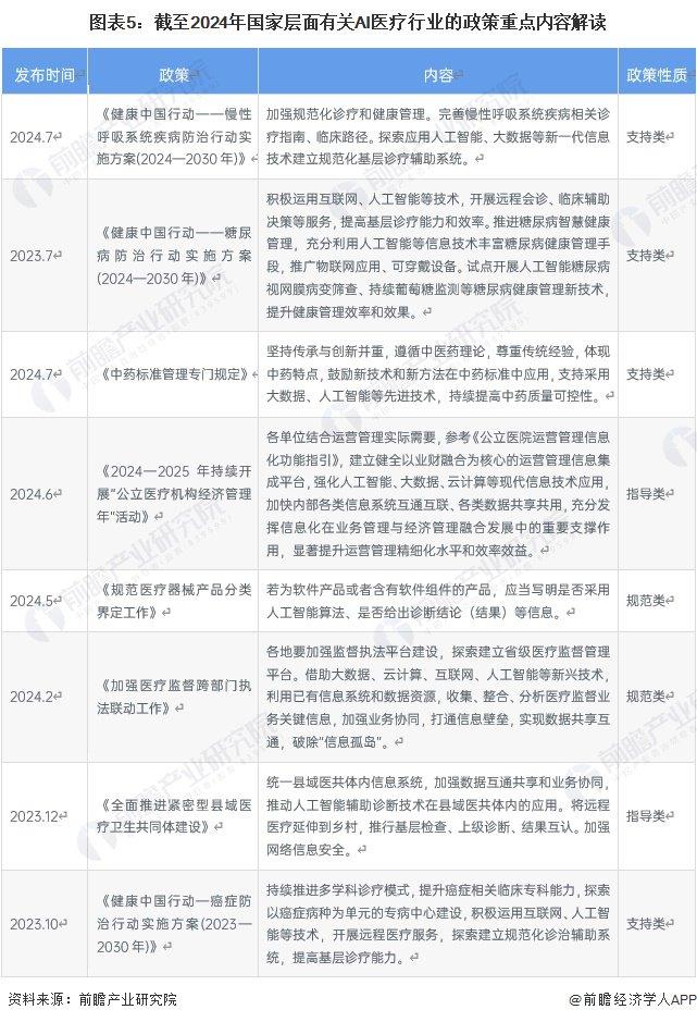 AI医疗是中国医疗行业转型升级的发展重点,为更好地规范和促进中国医疗卫生事业的发展,国家及相关主管部门制定了一系列的支持、指导和规范类政策,旨在完善AI医疗应用标准体系,同时更大力度地探索人工智能辅助诊疗和人工智能远程医疗应用。