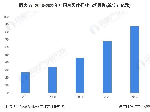2019-2023年,在产业政策的支持下,智能硬件和人工智能技术快速发展,从而推动中国AI产业化进程的加速。AI医疗行业作为AI产业的重要分支,得到了高速的发展,中国AI医疗市场规模从2019年的27亿元快速增长至2023年的88亿元,年复合增速达34%。 数字化转型网www.szhzxw.cn