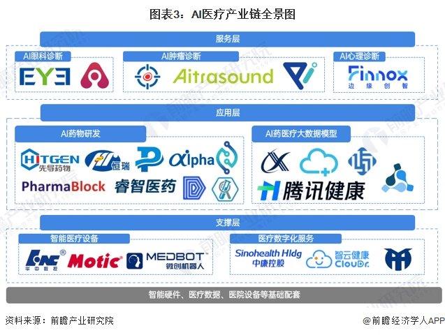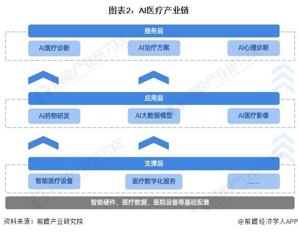 AI医疗行业产业链可分为支撑层、应用层和服务层,支撑层主要包括智能医疗设备以及医疗数字化服务;应用层主要包括AI药物研发、AI医疗大数据模型等,是目前中国AI医疗产业发展的重点;服务层则是在患者诊疗层面,运用AI模型进行辅助诊断、辅助决策、辅助手术等活动。