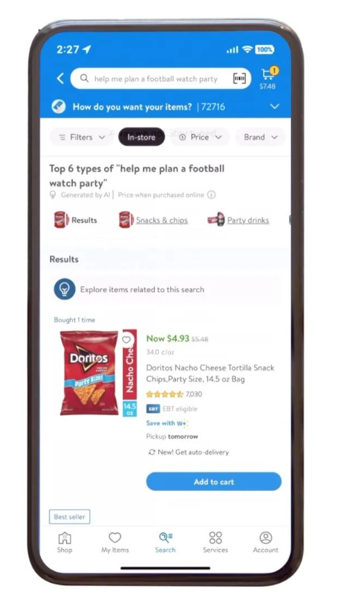 最值得注意的是,沃尔玛正在 iOS 上推出一项新的生成式人工智能搜索功能,允许顾客按使用案例搜索产品,而不是按产品或品牌名称搜索。例如,用户可以要求沃尔玛输出 “football watch party”所需物品的搜索结果,而不是专门输入薯片、鸡翅、饮料或 90 英寸电视的搜索结果。这些增强型搜索结果将跨越类别,可与谷歌的 SGE(搜索生成体验)相媲美,后者可以推荐产品并显示各种考虑因素以及评论、价格、图片等。