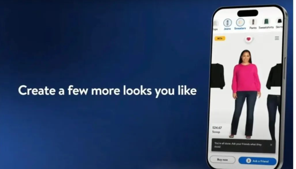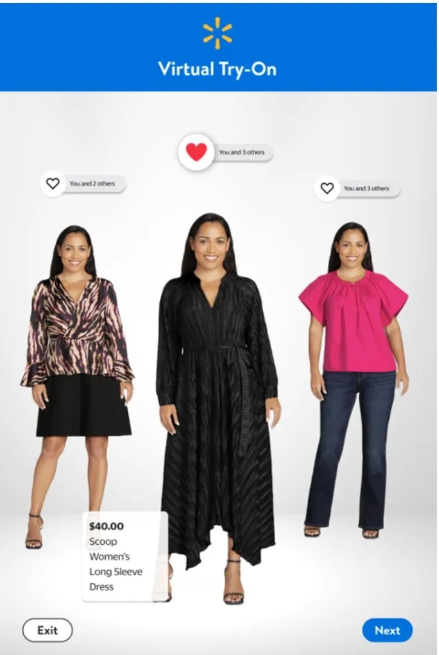 沃尔玛在 CES 上首次亮相的另一款新产品是 “Shop with Friends””,这是一款 AR 购物工具,顾客可以与朋友分享他们创建的虚拟服装,然后获得他们的反馈意见。该工具结合了沃尔玛去年推出的人工智能虚拟试衣技术和社交功能。