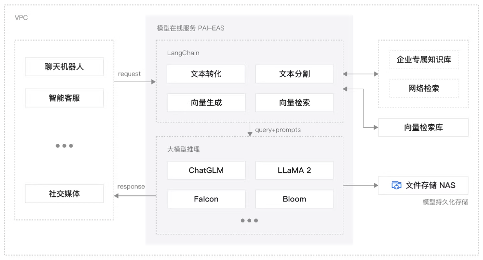 通过模型在线服务平台PAI-EAS的预置镜像,可以一键拉起ChatLLM-WebUI的应用服务,并通过预置的LangChain插件,快速集成企业业务知识库文件,一键将业务文件通过向量化的方法集成到向量存储检索库中。最终实现将大模型服务集成到企业自己的业务系统中。