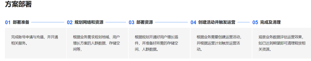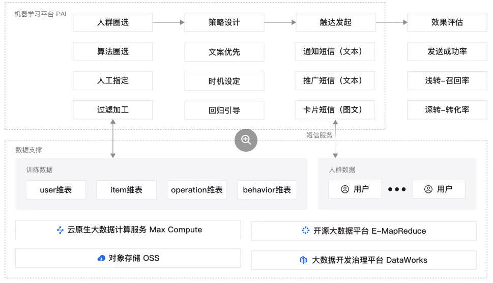 本方案架构包含数据支撑、智能用户增长、运营管理与触达三个核心模块,可将业务相关数据存储在阿里云OSS中,并结合数据开发治理平台DataWorks进行数据清洗,生成符合运营要求的训练数据、人群数据等;阿里云PAI为您提供的智能用户增长插件,可智能圈选待运营人群、生成运行策略,并联合阿里云短信服务,基于运营计划自动触达发起运营活动。