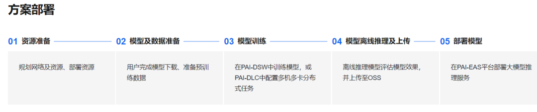 下图展示大语言模型(LLM)通过PAI-灵骏从基础开源模型到线上生产应用的开发全链路。涉及的阿里云产品包括机器学习平台PAI、对象存储OSS。步骤包含:资源准备、模型及数据等准备、模型训练、模型离线推理及上传和模型部署这五个阶段。用户在规划好网络和资源、完成资源部署后,可通过Huggingface 或 ModelScope等社区渠道下载Llama2模型,并可在灵骏智算平台的DSW实例中,完成准备预训练数据准备;训练阶段提供多种方案,保障模型效果的同时,提升大模型分布式训练效率;训练所获得的模型可上传至对象存储OSS,并且能够便捷地在PAI-EAS平台部署大模型推理服务。