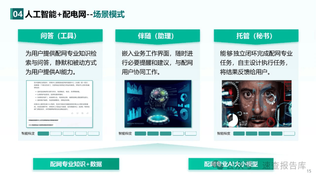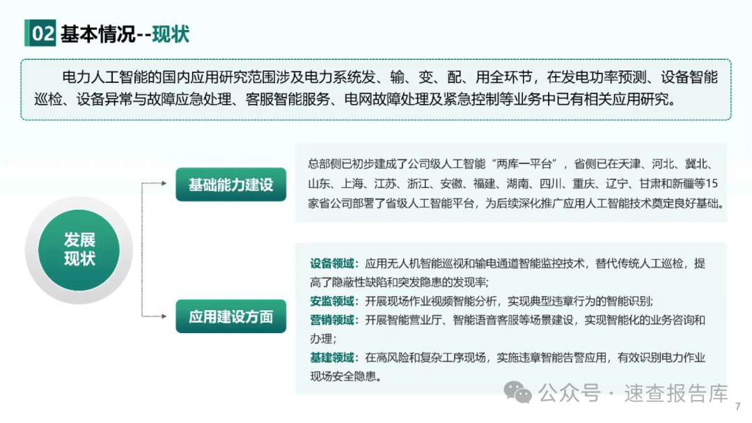总部侧已初步建成了公司级人工智能“两库一平台”,省侧已在天津、河北、冀北、山东、上海、江苏、浙江、安徽、福建、湖南、四川、重庆、辽宁、甘肃和新疆等15家省公司部署了省级人工智能平台,为后续深化推广应用人工智能技术奠定良好基础