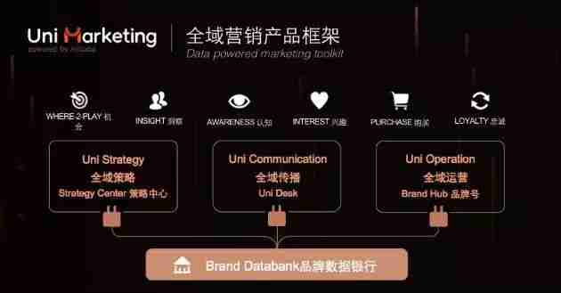 全域营销的产品组合包括“品牌数据银行”(Brand Databank)、“全域广告投放工作台”(Uni Desk)、阿里妈妈“品销宝”媒体产品、“品牌号”(Brand Hub),以及“全域策略”(Uni Strategy)。